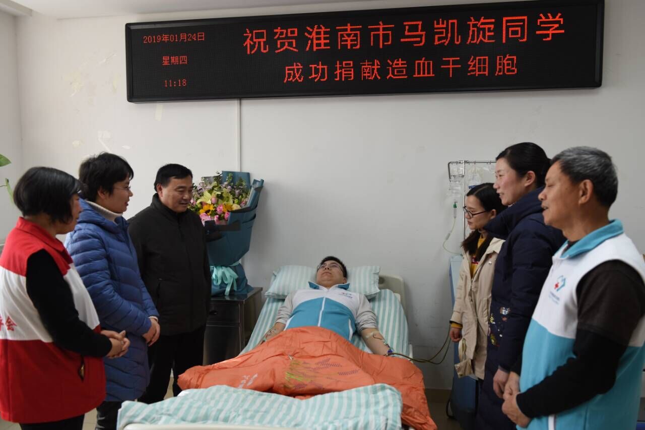 马凯旋于1月19日入住安徽省立医院,已住院6天。24日上午正是马凯旋血液采集的时间段,采集历时四个小时。这是他最难熬也是最期盼、最兴奋的一天。当学院领导一行到达医院时,马凯旋正在进行血液采集。看到院领导和辅导员的到来,马凯旋感到十分开心,心情也变得轻松起来。院领导询问了他的身体状态和心情感受,并叮嘱他有什么困难或身体不适,及时告知医院工作人员,随时保持与辅导员的联络。同时领导还关心马凯旋后期身体恢复情况,叮嘱他近期要多休息,确保身体完全恢复好。马凯旋对学校老师的关心很感动。他告诉老师自己在医院一切都很好,让学院老师们不用担心。院领导还与淮南红十字会志愿者和医院工作人员进行了交流,详细了解马凯旋入住这几天的身体状况和医院吃住情况,并对医院负责人的细心照顾和红十字会志愿者们的耐心陪伴表示感谢。