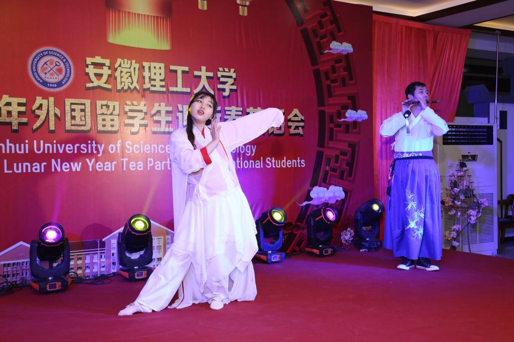 茶话会师生才艺展示活动丰富多彩、精彩纷呈。哈萨克斯坦姑娘的一首“Someone Like You”温婉动听,引来阵阵掌声;2018级学生代表表演的笛子伴奏舞蹈《女儿情》,舞姿柔美翩跹,笛声悠扬婉转,展示了我校学生的多才多艺;教师代表表演的黄梅戏《夫妻双双把家还》和京剧《武家坡》向留学生展示了安徽地方戏曲的独特魅力和中国国粹的大气磅礴;加纳留学生朗诵的《九月九忆山东兄弟》和《静夜思》诗歌,字正腔圆、感情真挚,表达了远离祖国求学对故乡和亲人的思念之情;表演环节在节奏欢快热烈的留学生大合唱“Lean on Me”中结束。