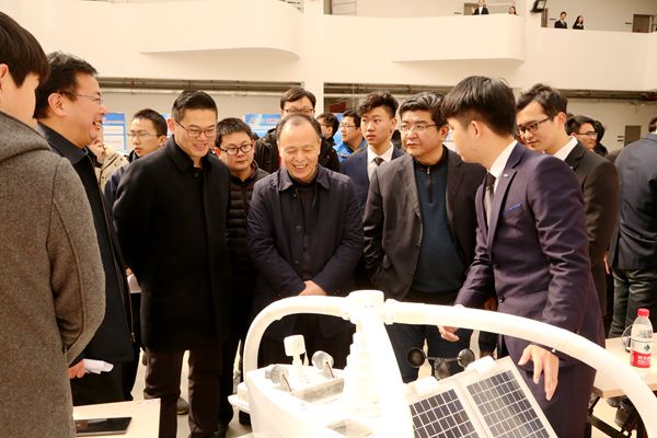 终审决赛采取作品展示、书面评审、汇报答辩三个环节相结合的方式进行。在作品展台前,郭永存、董雨认真听取了参赛选手们关于项目创意构思、性能原理及实用价值的分析汇报,仔细观摩了作品展板、实物模型、构造动画模拟演示,并就一些项目的技术原理、性能提升、前景应用等方面与参赛团队进行了深入探讨,为各团队项目的优化完善提供了指导。