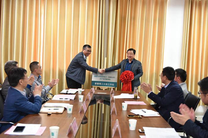 葛斌与我校后勤保障处处长秦朗共同为“安徽理工大学工作站”揭牌。