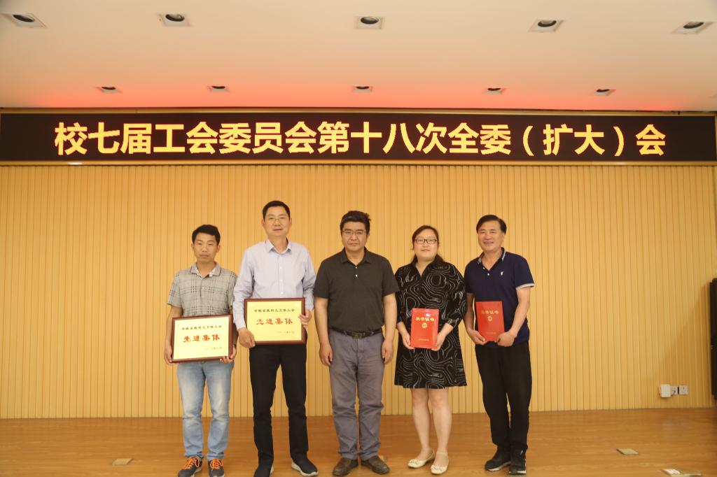 会上通报了安徽理工大学荣获“安徽省劳动竞赛先进集体”,对获得安徽省教科文卫体先进集体的土木建筑学院分工会、化学工程学院分工会以及先进个人(数学与大数据学院李勇、计算机科学与信息学院张玉)进行了表彰,对获得安徽省总工会“模范职工小家”的地球与环境学院分工会举行了授牌仪式。