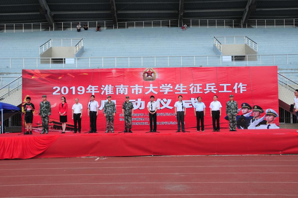 5月27日下午,2019年淮南市大学生征兵工作启动仪式在我校隆重举行。淮南市委常委、淮南军分区政委项金宏,淮南市副市长李朝晖,校党委常委、副校长吴照明,淮南军分区副司令员汪海涛及在淮各高校负责同志出席仪式。我校各学院领导、辅导员代表、6千余名学生代表参加了仪式。