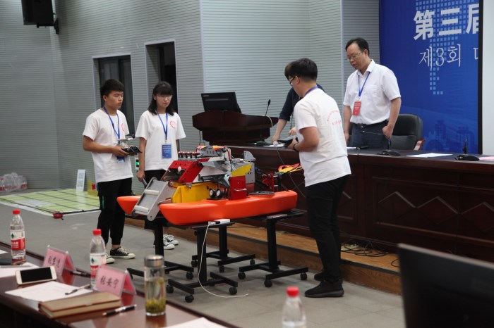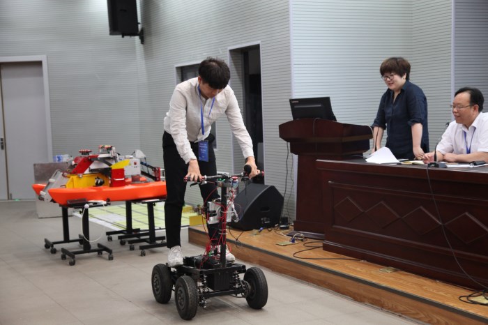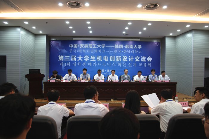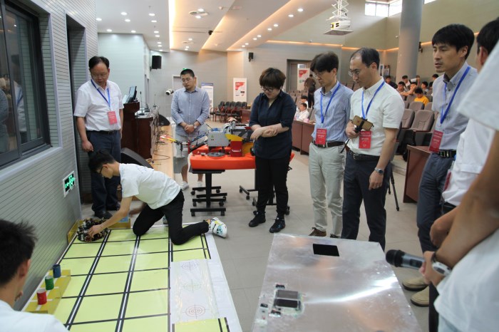 本届作品主题是“节能减排,物料搬运”,我校6件、韩方5件,共11件作品参加交流会。双方参赛学生用英语对作品设计、结构和功能等进行了PPT汇报和作品现场演示,随后评委和现场师生提问,参赛学生进行答辩。作品设计巧妙,结构精细,自动化水平高,充分展示了两校大学生高层次的创新思维和实践能力。经评委现场打分,韩方Smart Cart等2件作品获一等奖,3件作品获二等奖。我校水上智能巡航机器人等3件作品获一等奖,3件作品获二等奖。