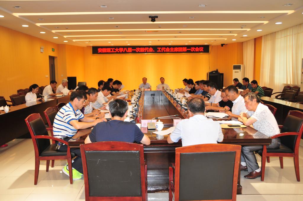 8月30日下午,学校八届一次“两代会”主席团第一次会议在舜耕苑二楼会议室召开。校党委书记、教代会执委会主任郭永存主持会议。校党委副书记、校长袁亮,党委副书记虞宝桃出席会议。