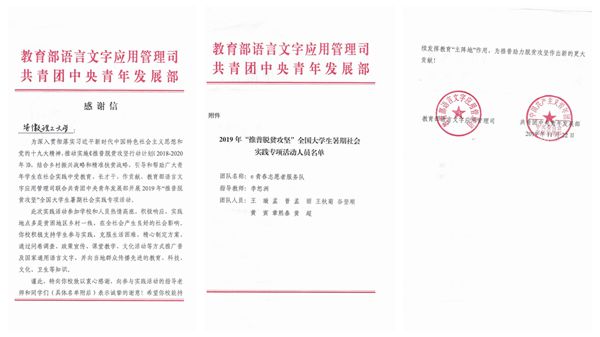 近日,共青团中央对2019年全国大中专学生志愿者暑期“三下乡”社会实践活动表现突出的单位、团队、个人和成果进行通报表扬。我校团委荣获2019年全国大中专学生志愿者暑期“三下乡”社会实践活动“优秀单位”,这也是学校连续五年获此殊荣;张岚老师获评全国社会实践“先进个人”称号。另外,在“三下乡”社会实践活动“推普脱贫攻坚”专项实践中,我校计算机科学与工程学院“e青春志愿者服务队”表现突出,受到教育部语言文字管理司、共青团中央青年发展部联名表扬。
