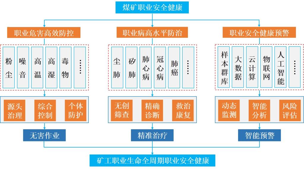 袁亮院士强调,“工业4.0”势头强劲,精准开采、精准医疗、大数据等技术突飞猛进,给煤矿职业安全健康发展提供了前所未有的机遇,为实现煤矿作业环境革命和煤矿从业人员职业生命全周期职业安全健康提供了可能,在此背景下,他提出了理工医多学科交叉融合的煤矿粉尘防控与职业安全健康科学构想。该构想基于理工医多学科交叉融合,以大数据、云技术、人工智能和物联网等高新信息技术为支撑,创新“四位一体”科学研究方法,以煤矿无害作业、职业病精准治疗和职业安全健康智能预警等为核心,最终实现煤矿从业人员职业生命全周期职业安全健康。