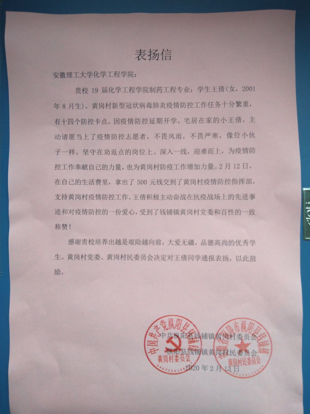 2月13日,铜陵市枞阳县钱铺镇黄岗村疫情防控指挥部收到一笔500元的特殊捐款和一封志愿服务的信件,表明自己志愿参与新冠肺炎疫情防控,落款名为王倩。经核实,王倩为安徽理工大学化学工程学院制药工程专业2019级学生,为此枞阳县钱铺镇黄岗村向化学工程学院发来表扬信。