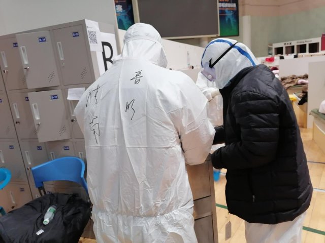 下午在宾馆休息了一会。后来因为要提前坐车赶往工作地点——武汉体育中心方舱医院,所以就简单吃了点泡面。一般我们要提前接班,更换完防护服就直接入舱。