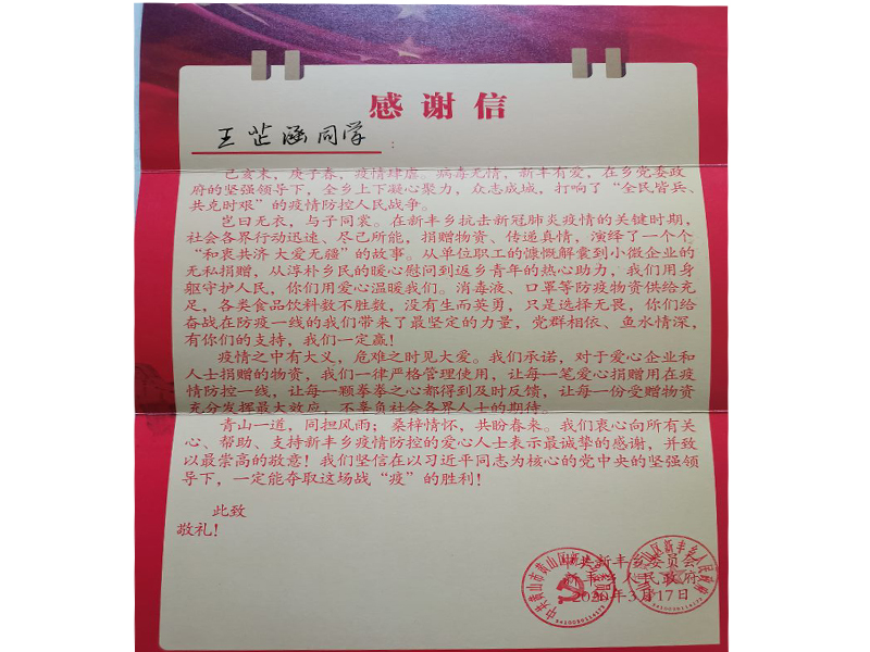 随着新冠肺炎疫情的发生,让本该在家欢度春节的王芷涵一家人都投进了紧张忙碌的疫情防控工作中去。王芷涵父亲是当地村委会的党支部书记,母亲是乡政府卫健办的工作人员。王芷涵非常理解和支持爸爸妈妈的工作,主动承担起家务,做饭、洗衣、搞卫生……每件事都做得井井有条、一丝不苟。而且当她得知乡里招募志愿者参与防控工作时,就在第一时间报名参加。“父母都奋战在防控一线,我也要紧跟他们的步伐参与其中,作为一名大学生,有知识有活力,更应该发挥自己的作用。” 王芷涵这样说道。因在疫情防控志愿活动中表现优秀,她收到了来自黄山市黄山区新丰乡党委和政府的感谢信。