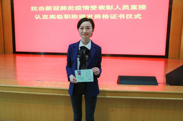 4月15日下午,安徽省卫生健康委、人社厅联合举行抗击新冠肺炎疫情受表彰人员直接认定高级职称颁发资格证书仪式,对在疫情防控工作中获得国家级表彰的7名同志直接认定高一级职称,我校第一附属医院(淮南市第一人民医院)日间医疗中心护士长夏晓丹被直接认定副主任护师职称资格,并现场领取高级职称资格证书。