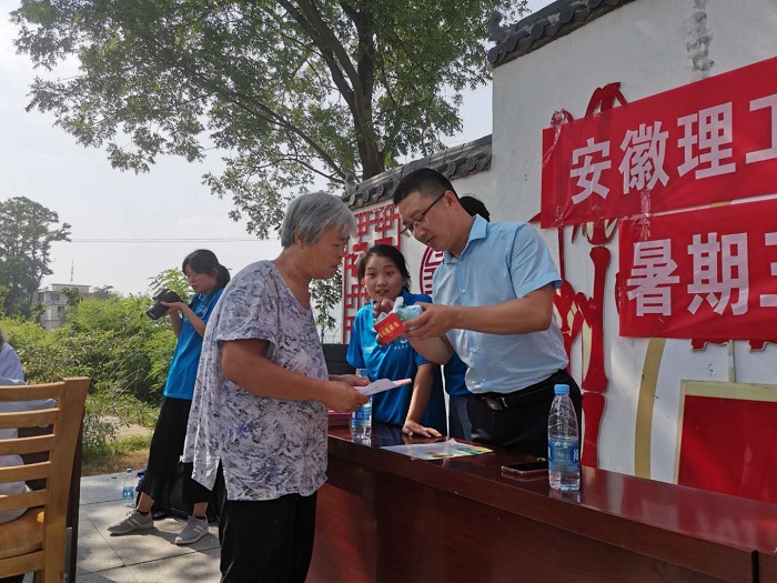 “近年来,安徽省因地制宜大力推广‘四带一自’产业扶贫模式,形成了一大批具有地方特色的扶贫产业,有效拓宽增收渠道,带动贫困户增收脱贫。”材料学院的志愿者孔垂雷同学在现场耐心地为村民们普及着脱贫攻坚的相关知识。