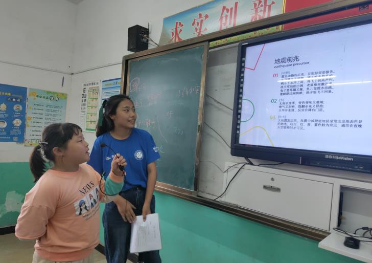 志愿者们结合学院专业特色做了精心的教学设计,他们为高年级同学准备了自然灾害主题的科普教育,向他们介绍淮河治理、当地地理水文知识,普及地震逃生和泥石流防治等安全常识;为低年级同学介绍地球的生命演化过程,讲解地球生命的演变和生命的起源,激发他们学科学、爱科学兴趣。科普教育结束后,队员们准备了丰富多彩的户外素质拓展活动与学生们一起游戏,“萝卜蹲”、“背夹气球”等,志愿者与小学生们玩在一起,乐成一片。
