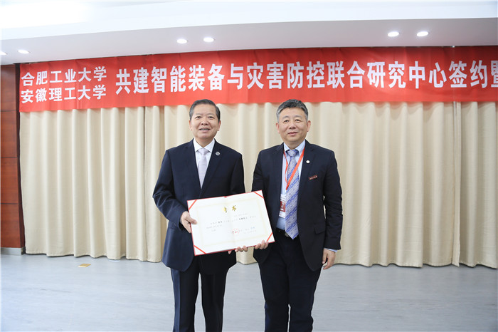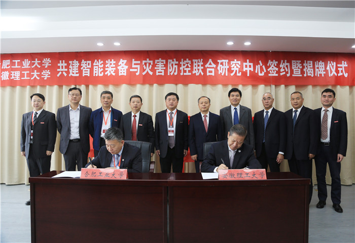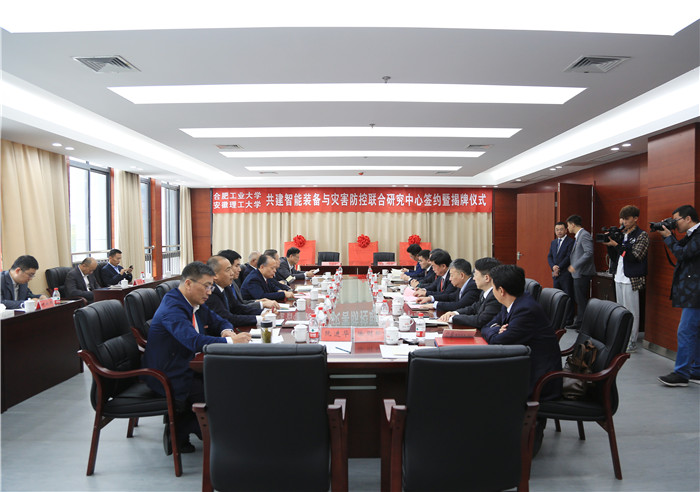 梁樑、袁亮代表双方签署了《合肥工业大学安徽理工大学共建智能装备与灾害防控联合研究中心合作协议》。梁樑、袁亮、魏臻、王宁为智能装备与灾害防控联合研究中心揭牌。