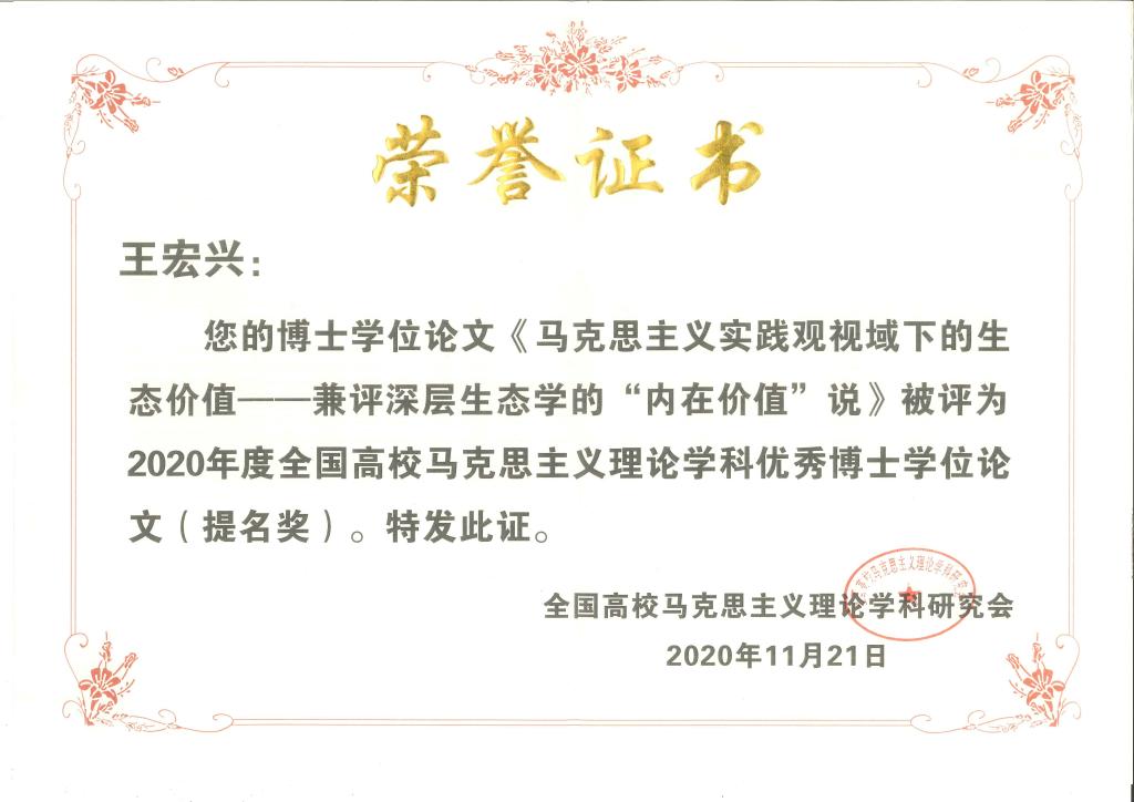 王宏兴,中国人民大学2017届博士毕业生,指导老师是中国人民大学马克思主义学院张云飞教授。在本次评选中,王宏兴老师的毕业论文《马克思主义实践观视域下的生态价值——兼评深层生态学的“内在价值”说》获得“2020年度全国高校马克思主义理论学科优秀博士学位论文(提名奖)”。该论文全面探讨了生态价值的实践视角、生态价值的生成与实现、生态价值的构成与要求、生态价值的社会表征和表现、生态价值的实践评价等,并对深层生态学的“内在价值”说进行了批判性分析。论文对于系统构建马克思主义生态文明理论,推进形成人与自然和谐发展现代化建设新格局具有重要的理论意义和现实价值。