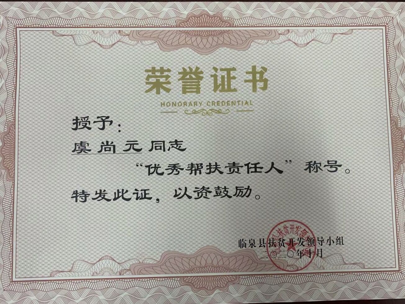 南杨小庄村第一书记、工作队队长虞尚元获“优秀帮扶责任人”称号,副队长黄敏和扶贫专干杨显成均获“优秀驻村帮扶干部”称号;王香铺村第一书记、工作队队长秦淮滨获“优秀驻村帮扶干部”称号。