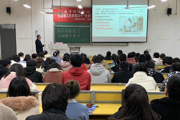 12月1日下午,安徽省免疫学会副理事长、淮南市性病艾滋病防治协会副会长、医学院王健教授应邀做客“百川大讲堂”,在明理楼105教室作“世界艾滋病日”主题宣讲报告。