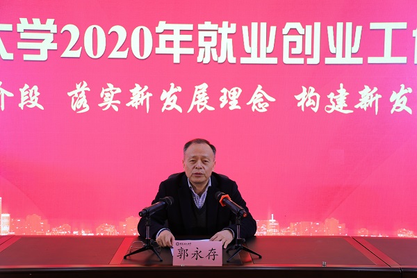 郭永存在讲话中指出,2020年注定是非凡的一年,面对经济下行压力持续加大的重大挑战、突如其来的新冠肺炎疫情抗疫大战,全校上下坚定信心,主动应对,主动求变,主动突围,通过就业攻坚专项行动,聚力重点、综合施策,圆满实现了稳就业工作目标,毕业生初次就业率稳居安徽省本科高校首位,本科生研究生考取率再创新高。学校多次作为唯一省属高校代表在全省就业创业工作视频会议、全省高校就业工作会议、教育部就业工作安徽高校专题调研视频会议、李国英省长参加的全省就业工作推进会上发言,获得第三届安徽省就业工作先进集体荣誉称号,受到省政府表彰。郭永存充分肯定了我校2020年就业创业工作成绩,并代表学校向辛勤奋战在就业创业工作一线的同志们表示感谢。他从提高政治站位,切实把做好就业创业工作作为重大政治任务;充分认识就业形势复杂性、严峻性,把思想和行动统一到党中央、国务院关于做好“稳就业”工作决策部署上来;积极转变思维范式,创新工作方式;大力拓宽就业渠道,努力提高毕业生就业质量;开展好毕业生就业跟踪调查,将毕业生就业质量作为学科发展重要评价指标;加强“招生—培养—就业”全链条协同联动,将就业工作纳入“双一流”创建方案,以出口导向统筹人才培养改革;多措并举,落实包保责任制,全校上下共同发力等方面就进一步推深做实我校2021届毕业生就业创业工作提出了明确要求。