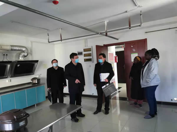 周旭一行分别前往学生处、国际交流与合作处、研究生院、后勤保障处等部门,了解工作开展情况,掌握目前学生离校和留校信息,参观学生处组织开展的线上家长会,关心留校学生的住宿及饮食保障,并深入留学生宿舍和餐厅,与留学生亲切交谈,关心其学习和生活。