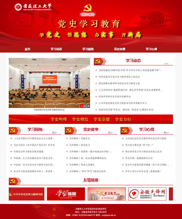 师生可通过网址(http://dsxxjy.aust.edu.cn)访问,也可直接点击主站大图区“党史学习教育”图片进入“党史学习教育专题网站”。