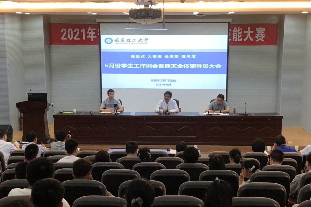 学生处负责同志解读了《安徽理工大学辅导员考核办法(2021年修订)》,就近期疫情防控工作、转专业学生宿舍调整、暑期学生留校安排、智慧学工系统建设情况及暑期辅导员队伍培训工作进行了部署和安排;并对本学期学生违纪情况进行了通报。