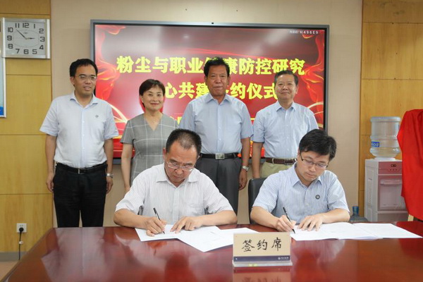 7月12日下午,我校与中国矿业大学共建“粉尘与职业健康防控研究中心”签约仪式在该校南湖校区行健楼会议室举行。校党委副书记、校长袁亮出席仪式,并受到中国矿业大学党委书记刘波、副校长周福宝的热情接待。中国职业安全健康协会党委书记、理事长王德学,党委委员、副理事长李德清,党委委员、常务副秘书长毕强出席仪式。
