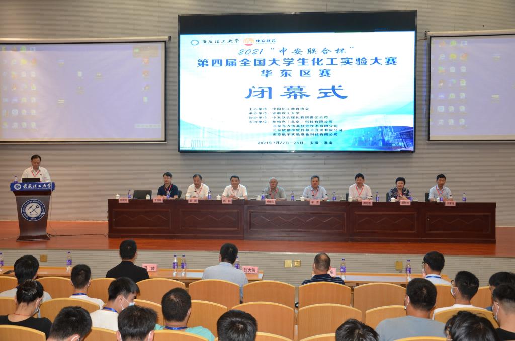 华东赛区组委会主任、教育部高校化工类专业教指委副主任委员、华东理工大学副校长辛忠教授,教育部高校化工类专业教指委委员、常州大学党委书记陈群教授,教育部高校化工类专业教指委委员、合肥工业大学崔鹏教授等专家全程指导竞赛,中安联合煤化有限责任公司副总经理、总工程师周立进教授级高工出席闭幕式。校党委常委、副校长郑明东教授出席闭幕式并讲话。本次大赛组委会秘书长、化学工程学院院长邢宏龙主持闭幕式。