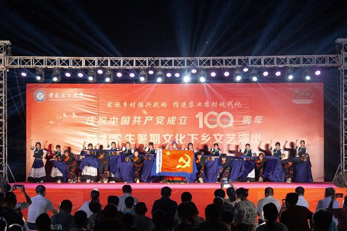 将文化下乡同乡村振兴相结合,将党史教育与美育实践相结合。7月中旬,地环学院在学校乡村振兴重点推进村——淮南市大通区孔店乡新华,开展了庆祝建党100周年暨大学生暑期文化下乡文艺演出,志愿者们用歌舞和器乐演奏为当地村民们带来一场别开生面的视觉盛宴,展现了中国共产党百年奋斗的历程、少数民族人民爱党爱国的赤忱之情和中华儿女齐心协力四海抗疫的生动场景,在奏响青春主旋律的同时,以美化人,助力乡村振兴,服务当地经济社会发展。