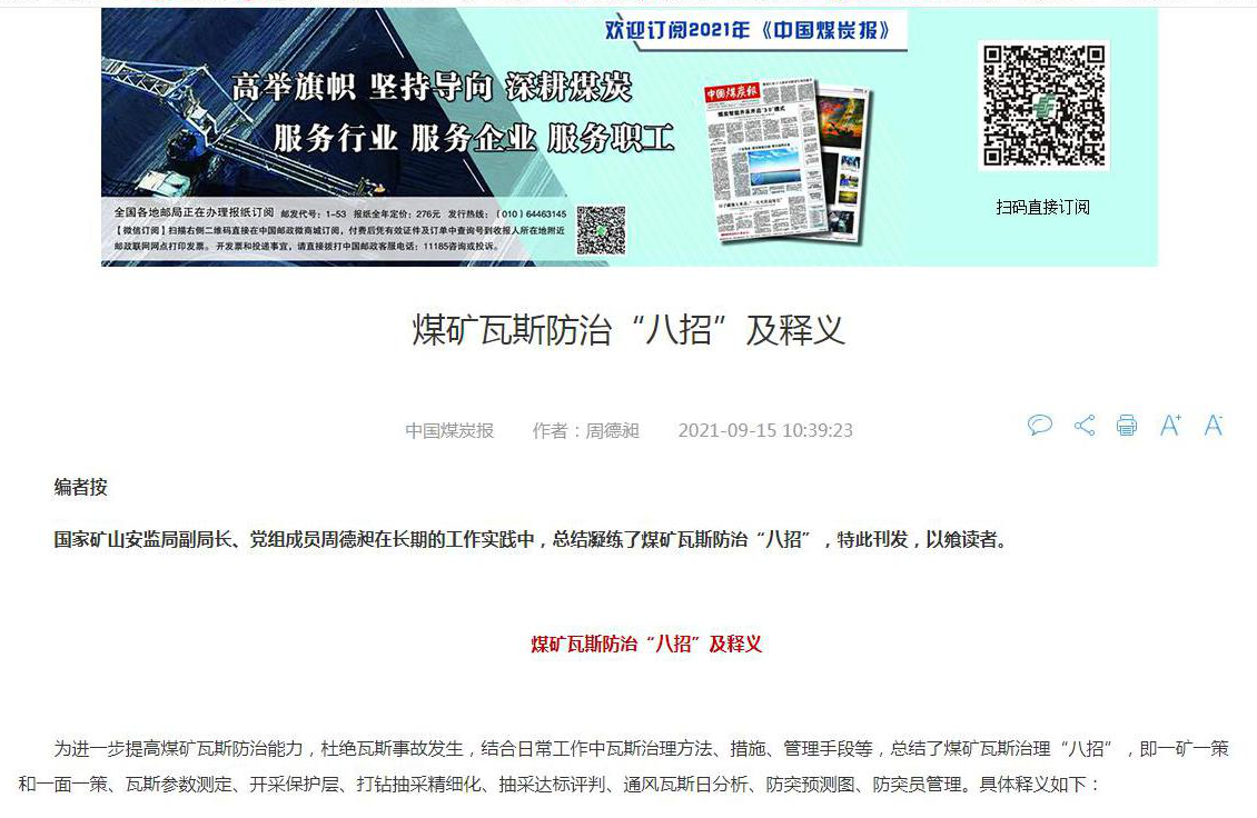 近日,中国煤炭报以《煤矿瓦斯防治“八招”及释义》为题,刊登了我校校友周德昶煤矿瓦斯防治治理研究成果。
