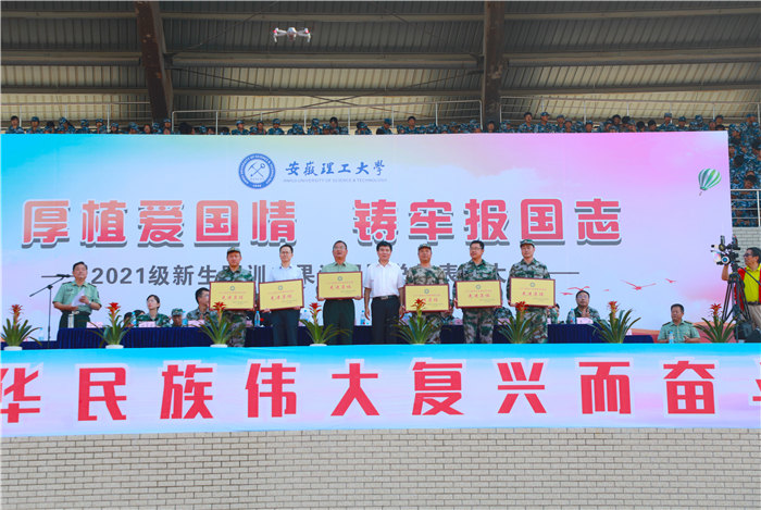 宫能平宣读了学校对军训期间表现突出的优秀学员、优秀内务寝室、优秀教导员、优秀教官、优秀国防教育征文获得者和队列会操优胜单位、先进集体的表彰决定。与会校领导为获得表彰的先进集体和个人颁奖。