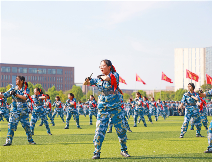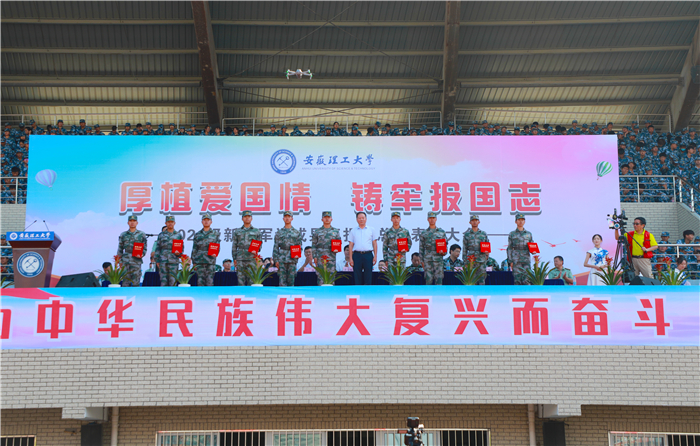 伴随着现场学生组成的方阵摆出“10、9、8、7……”数字倒计时字样,军训汇报表演正式开始。由900名学员组成的花样操方阵摆出“百年奋斗”“圆梦今朝”“我爱安理”“筑梦安理”“奋进新时代”“创建双一流”等字样,表达了2021级新生对安理无比的热爱和对学校创建“双一流”最真挚的期许。伴随着雄壮的阅兵进行曲,在国旗、校旗方队的引领下,由17个学院2021级学生组成的军训团方阵,迎着朝阳,迈着整齐矫健的步伐,依次通过主席台接受检阅。他们坚定的神情、飒爽的英姿、整齐的队列、嘹亮的口号充分展示了军训刻苦训练取得的骄人成果,赢得在场师生的阵阵掌声。汇报表演精彩纷呈,在随后进行的匕首操、军体拳、捕俘拳、战术动作表演、单个军人队列动作表演中,军训学员们目光坚定,动作整齐划一、刚健有力,一招一式间尽显披荆斩棘的壮志与豪情;韵律操表演,青春朝气,展示了大家蓬勃向上的精神风貌;精彩的大合唱《人民军队忠于党》《没有共产党就没有新中国》、爱国诗朗诵《奋斗吧!安理人》表达了同学们对党、祖国和母校深深的爱。