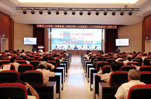 医院党委委员、副院长董斌主持动员会,医院党委委员、副院长刘新矿宣读《关于调整安徽理工大学第一附属医院(淮南市第一人民医院)等级医院复评领导小组及专业组成员名单的通知 》;医院院党委书记、院长杨立新做动员讲话并主持培训会,鲁超开展《攫取评审核心要义,推动医院品质提升——暨三级医院评审标准(2020版)解读与思考》专题培训。