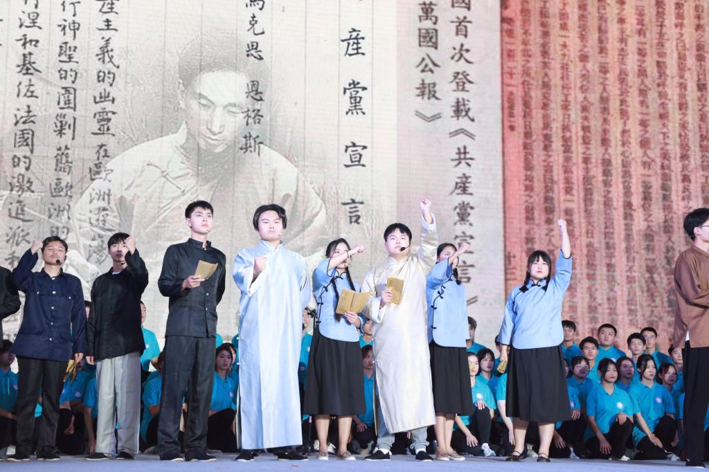 “中国共产党的诞生,这是开天辟地的大事变。”讲述人马克思主义学院教师张羽在党史讲述环节慷慨激昂地介绍着南湖红船上的伟大建党精神。沿着党史发展的脉络,3名讲述人带领全场观众穿越了新民主主义革命时期的浴血奋战,感受了社会主义革命和建设时期的伟大变革,迈过了改革开放和社会主义现代化建设新时期的中国道路,踏上了中国特色社会主义新时代向第二个百年奋斗目标进军的新征程。在党的百年伟大历程中,党始终践行让人民生活幸福这一“国之大者”,彰显了中国共产党一脉相承的人民立场、一如既往的赤子情怀、一以贯之的价值追求。