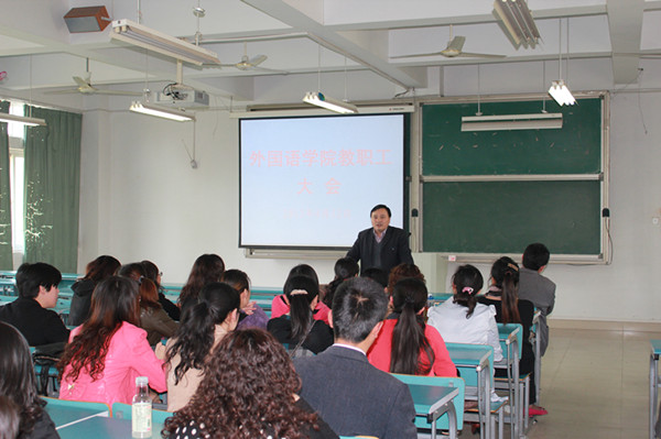 4月12日下午,外国语学院在医教410教室召开全体教职工大会,部署推进学院教学质量建设活动,院党委书记石秀光主持大会。