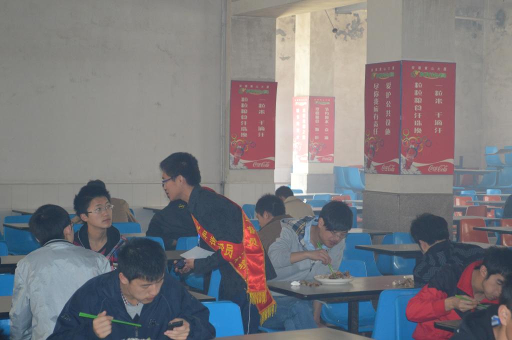 活动通过在食堂周边张贴宣传横幅和海报,发放宣传单、现场进行问卷调查、签名承诺和文明监督劝导等方式,向全校大学生发出号召,倡议大家加入“光盘行动”, 从小的生活习惯做起,从节约每一粒粮食做起,争做勤俭节约的学习者、实践者、传播者和校园文明新风尚、传播青春正能量的引领者。在食堂入口处“争做光盘族”宣传展板引人注目,“倒掉的是饭菜,流走的是血汗”、“请珍惜你盘中的每一粒饭”、“少食多取”等提示标语在餐桌前也随处可见,特别是那些胸挂工作牌、身披绶带的文明监督劝导员更成为了校园餐厅的一道靓丽的风景线。