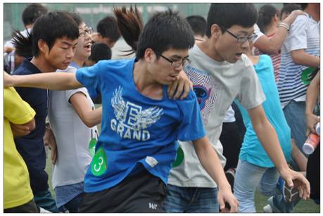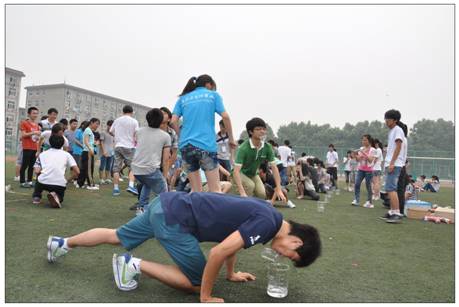 5月25日上午八点,北区足球场上,加油声欢笑声此起彼伏。这是5.25趣味心理运动会的活动现场。参加此次运动会的共计17支队伍,每支参赛队伍由4男2女6人组成。分别参加了编花篮、搭桥过河、链接加速、心心相印、衔杯传水、七彩连环炮六个项目。每个项目都是竞技和趣味相结合,使同学们在欢乐中体会运动与协作精神。