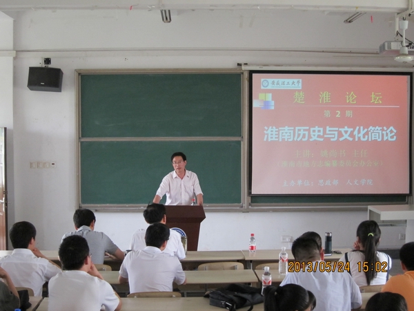 5月24日下午,应思政部、人文学院邀请,我省著名文史专家、淮南市地方志编纂委员会办公室主任姚尚书作客“楚淮论坛”,为我校广大师生作“淮南历史与文化简论”的学术报告。思政部副主任孙功教授主持学术报告会。