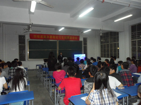5月31日晚7点,创维淮南办暑假实习生招聘宣讲会在经管楼108教室举行。创维淮南办王经理主持本次会议。