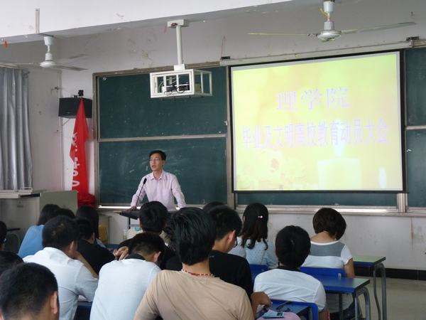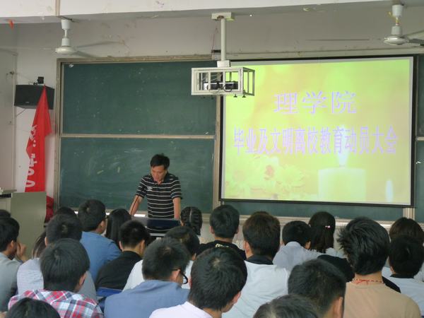 6月9日下午3点,理学院召开2013届毕业生全体学生大会,进行文明离校教育动员。理学院党委副书记李勇出席会议并讲话。