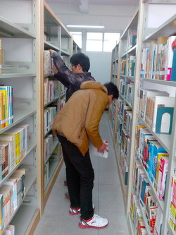 该队伍劳动地点是北校区图书馆,主要负责帮助图书管理员整理图书,清理书架上的垃圾及灰尘。在图书馆老师的指导下,他们明确分工,女同学拿起抹布掸去书架上的灰尘,男同学负责将归还的图书重新放回书架。看似简单的过程做起来可真不容易。拿书、看编号、找区域、对书号、摆放、整理等过程,让他们真正体会到耐心的价值!