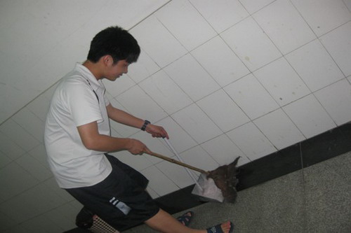 该分队设立8个小组,每周末都会有一小组帮助北校区青年教师公寓的管理员打扫走廊的卫生。老师是辛勤的园丁,同学们利用课余时间为老师做些力所能及的事情,博得了很多老师的一致称赞。当然,劳动中的他们显得更美丽,他们秉承不怕苦不怕累的精神,能快速高效地完成管理员安排的工作任务,并体会到从真诚付出造福别人的自豪感!