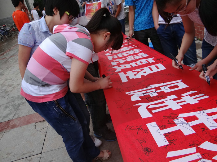 活动现场摆放了第23个全国“土地日”宣传展板,向同学们宣传 “珍惜土地资源,节约集约用地”观念,呼吁全社会牢固树立珍惜土地资源、节约集约用地意识,大力提升土地节约集约利用水平,活动现场制作了签名横幅,过往的老师、同学纷纷提笔写下了自己的名字,以表示对土地资源保护的支持。食堂的工作人员也积极响应国家号召,在签名横幅上写下自己的名字,大叔说:“我虽然不知道什么其他的,但我知道,保护土地资源是为了我们自己好。”大叔的话质朴而真诚。国家,为千秋万代计,不只为一时计。