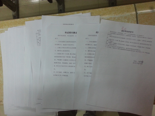 会后,组织了同学们考风考纪专题知识考试,并签署诚信考试承诺书。辅导员与各班班长签订考试“零作弊”目标责任书,号召并期望各班班长争做诚信考试的宣传者、实践者、指导者,师生共同努力,确保考试“零作弊”目标的实现。