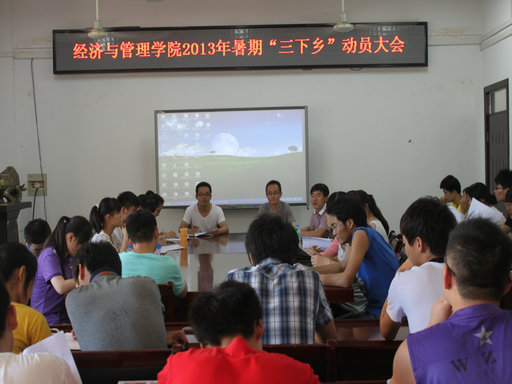 7月2日晚7:00,经管学院在3楼会议室召开了此次暑期“三下乡”社会实践活动动员大会,院党委副书记王勇、各年级辅导员及各年级学生代表参加了会议。院团委书记耿家营主持动员会,