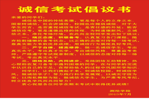学院精心制作了诚信考试倡议书。倡议书把学院“端正态度 积极备考”、“严于自律 提高修养”的提醒化为一个个醒目的警示牌,时刻提醒学生诚信考试。同时学院要求各班级团支部召开一次诚信考试主题班会,就考试心态、考试准备、考试纪律等各方面问题进行了广泛宣传教育和动员,并号召全体同学签订一份诚信考试承诺书。在承诺书上,全体学生郑重承诺:刻苦学习,全力迎考,严格自律,诚信做人,拒绝作弊!另外,学院还加强对学生的人文关怀,提醒学生考试积极备考,带好学生证、笔、橡皮、专用耳机等必需考试用具。