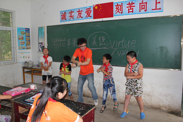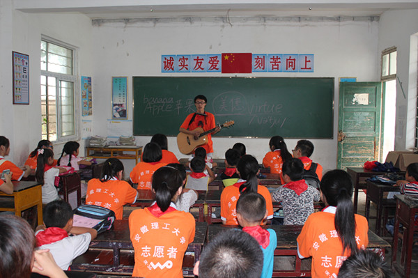 志愿者周琳娜同学用英文为孩子们讲解“美德”,介绍中国传统美德和良好的学习生活习惯;余梅同学用英文为孩子们讲解了“中国梦”,和孩子们一起分享远大的理想和梦想实现的途径。学习之余,志愿者们带领孩子们进行文艺表演,王新枝同学用吉他与口琴自弹自唱歌曲《童年》,祝福孩子们拥有一个美好的童年时光;仇超同学带来的精彩的舞蹈《江南STYLE》,把气氛推向了另一个高潮,并现场教孩子们学习《江南STYLE》的舞步,孩子们认真学习,跟着音乐,跳着舞步,玩得十分开心,现场气氛十分热烈。最后,王新枝同学还带来了精彩的葫芦丝独奏《瑶族舞曲》,文艺演出在悠扬的乐声中圆满结束。