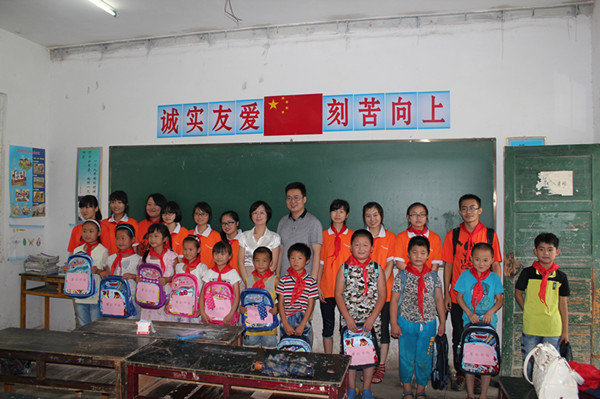 志愿者们到达目的地后,不顾大雨和奔波劳累,在与方楼小学校长交谈了解学校基本情况和学生信息后,立即来到教室看望同学们。程秀霞老师和志愿者们向孩子们赠送书包、笔盒等文具30余套,鼓励他们好好学习、健康成长,追求理想,以更加优秀的成绩回报父母和老师。