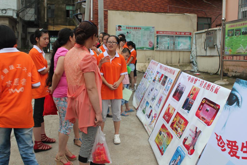 7月6日下午,外国语学院基层宣讲实践服务团的志愿者们来到淮南市大通区上窑镇上窑社区,开展党的十八大精神和“我的中国梦”宣传活动。