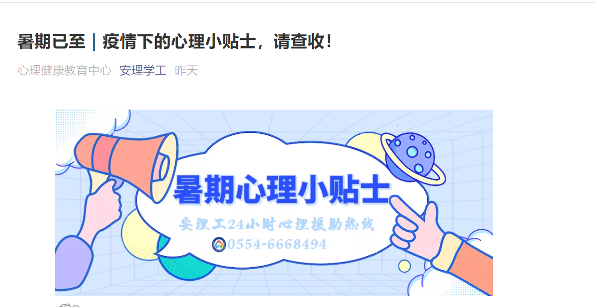 大学生心理健康教育中心第一时间开通暑期心理关爱服务线上平台。我校师生可通过中心心理援助热线、电子邮件、QQ在线咨询、全国各地心理援助热线等方式及时疏解不良情绪。此外,面对因疫情可能出现的普遍性心理困扰,中心还依托“安理学工”微信公众号和心理健康中心公众号,通过防疫知识科普、一问一答等方式加强防疫心理健康、心理自我调适等方面的宣传教育。