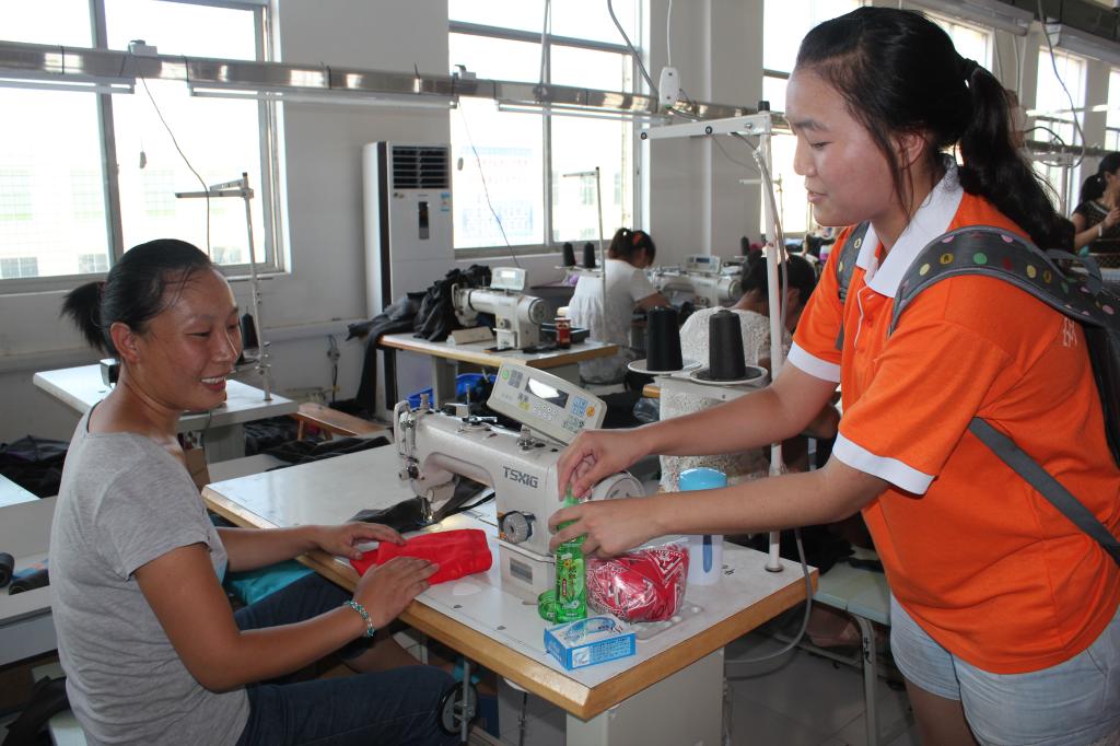 “我的妈妈也在上海的工厂做衣服,跟您一样也是一直要低着头,一不小心缝纫机还会扎到手,很辛苦。天气这么热,阿姨您可要注意防暑。”上海小伙王志君一边对正在缝纫机上赶制衣服的阿姨说着,一边把花露水、消毒皂和毛巾等消暑品放在她旁边。7月11日下午,蒙城县的室外温度高达38度。在这骄阳似火的时刻,蒙城县鑫磊服饰公司迎来了一群远道而来的客人——安徽理工大学外国语学院“关爱留守妇女”志愿者服务队。酷暑之下的工作车间,上百名当地留守妇女在马不停蹄地上拉链、缝口袋、贴商标,脸上汗水不断。年轻的大学生们抬着消暑物品,挨个给阿姨们送去。这些常年留守农村的阿姨们也纷纷拿出纸巾给大学生擦汗。45岁的王淑霞边掏纸巾给王志君边说着:“孩子,快擦擦汗吧。你们现在的小孩身体弱,更要小心中暑。”