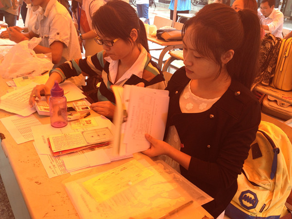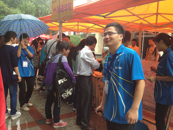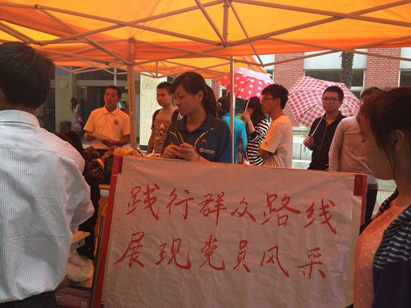 9月12日,在迎新工作现场,外国语学院开展“践行群众路线,展示党员风采”主题党日活动,学院党委组织了学生党员、入党积极分子组成志愿服务队,设立党员服务示范岗,配戴党徽,深入新生当中,率先垂范,为新生提供服务和帮助。